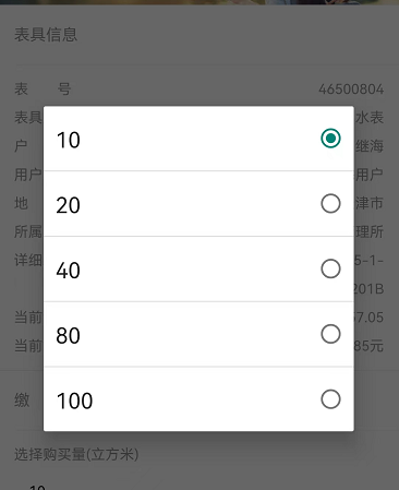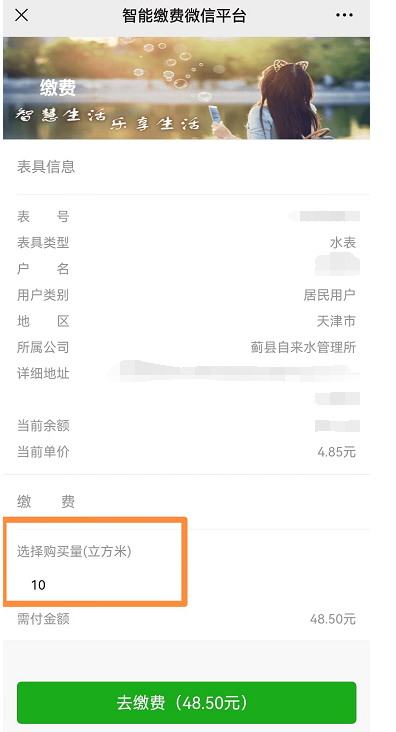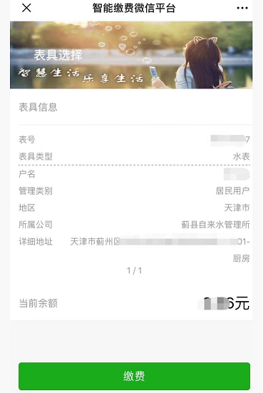 點擊繳費充值,如果綁定了多塊水表,左右滑動選擇要繳納水費的表具后點擊繳費按鈕。如圖